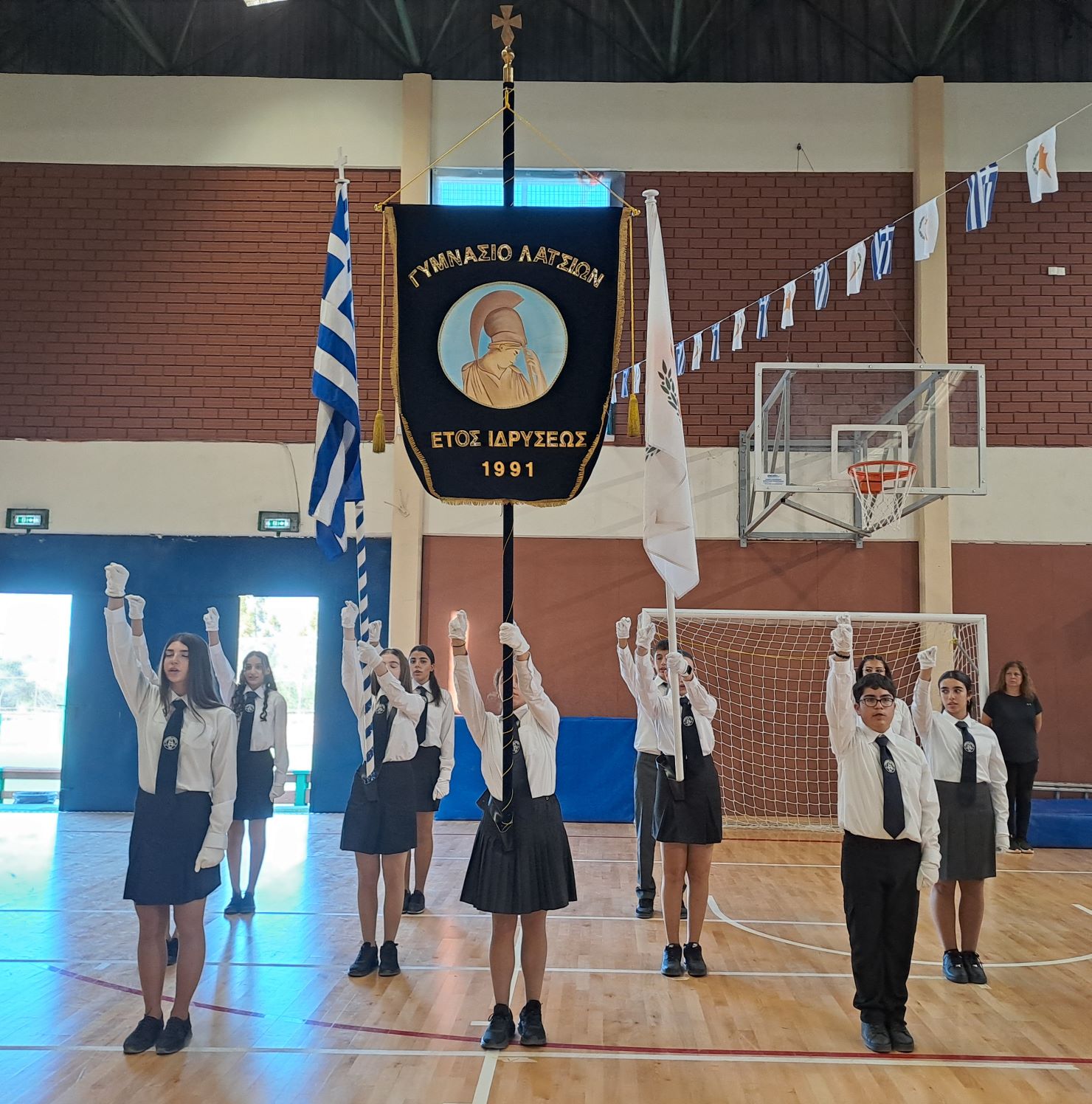 Την Παρασκευή 24 Οκτωβρίου 2025, πραγματοποιήθηκε στην παρουσία πολλών προσκεκλημένων η εκδήλωση για τη γιορτή της Σημαίας και την Εθνική Επέτειο του «ΟΧΙ» των Ελλήνων απέναντι στον Φασισμό. Στο πλαίσιο των εορτασμών, η Διεύθυνση και ο Καθηγητικός Σύλλογος του Σχολείου μας ανακήρυξαν τη λαβαροφόρο, τις σημαιοφόρους και τους παραστάτες του Γυμνασίου μας. Μετά την προσφώνηση και την παράδοση του Λαβάρου και των Σημαιών από τον Διευθυντή κ. Αντρέα Ονουφρίου, ακολούθησε ο όρκος των παραστατών, τον οποίο εκφώνησε η λαβαροφόρος Προκομμένου Κατερίνα του Γ3.